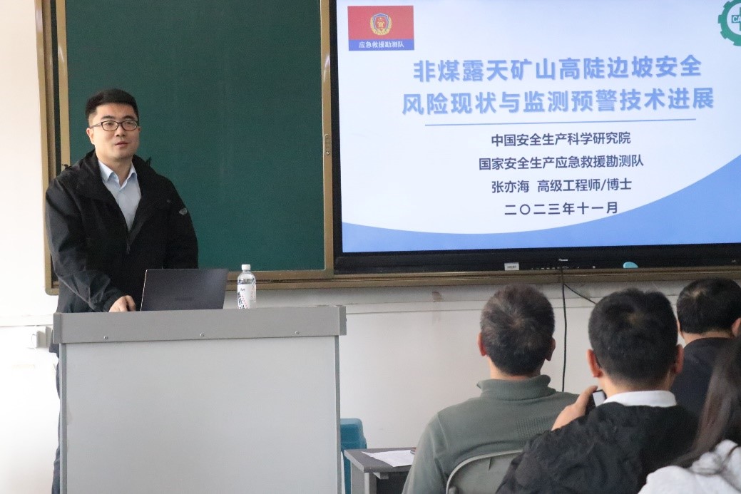中国安全生产科学研究院高级工程师张亦海作了题为“非煤露天矿山高陡边坡安全风险现状与监测预警技术进展”的专题讲座,从非煤矿山高陡边坡情况、边坡安全监测技术现状、边坡监测预警技术发展三个方面为同学们详细讲解了高陡边坡研究现状及监测预警技术的发展,研究取得的成果与应用,联系专业领域实际问题,引导同学们深入理解专业特色,紧密联系社会实际。